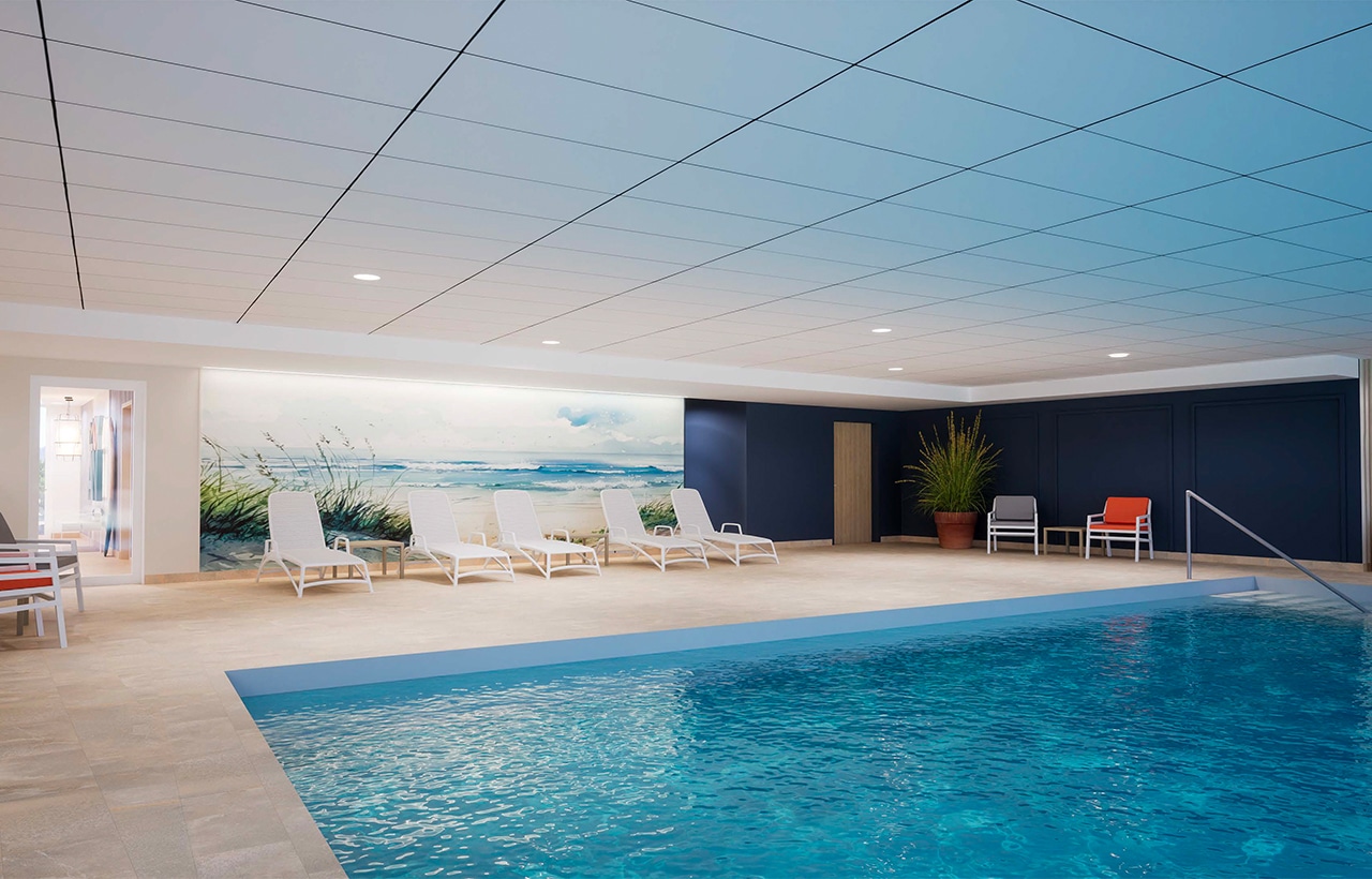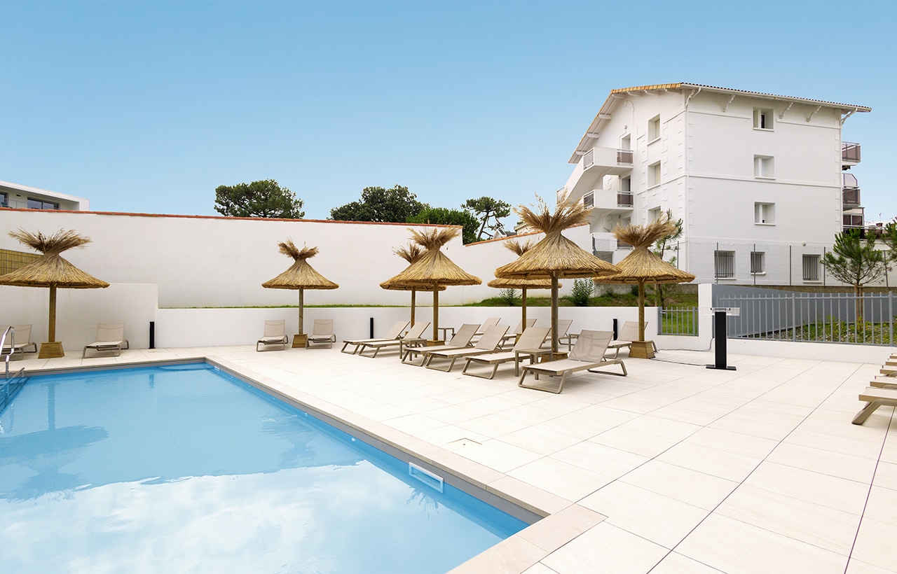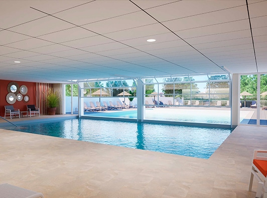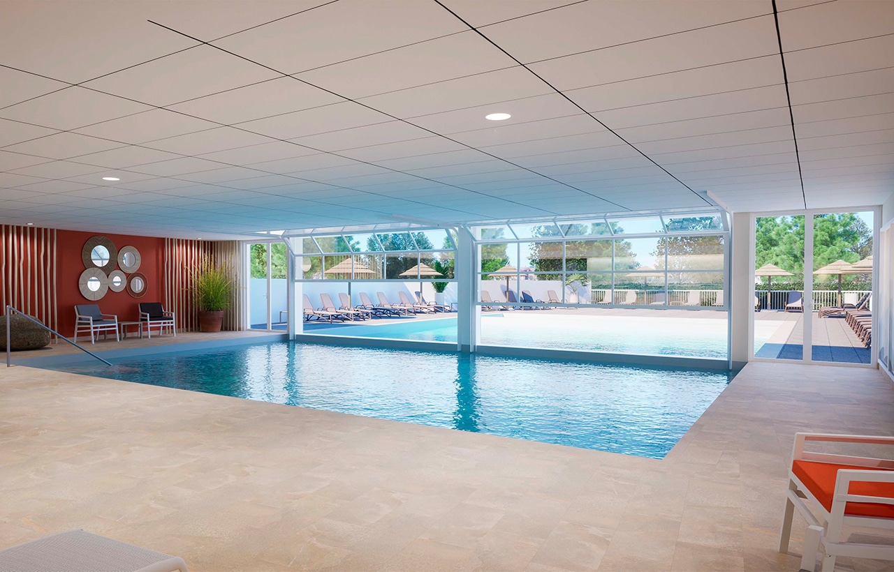 La résidence dispose d’un parking couvert, d’une piscine couverte chauffée et d’une piscine extérieure.